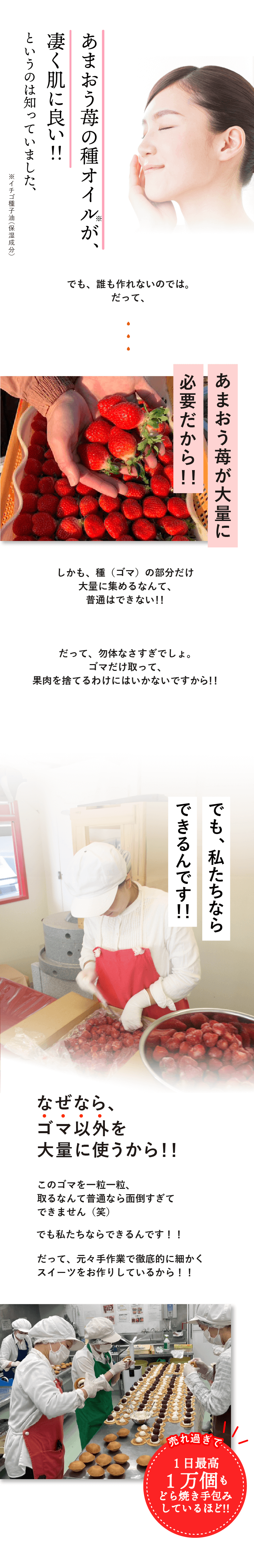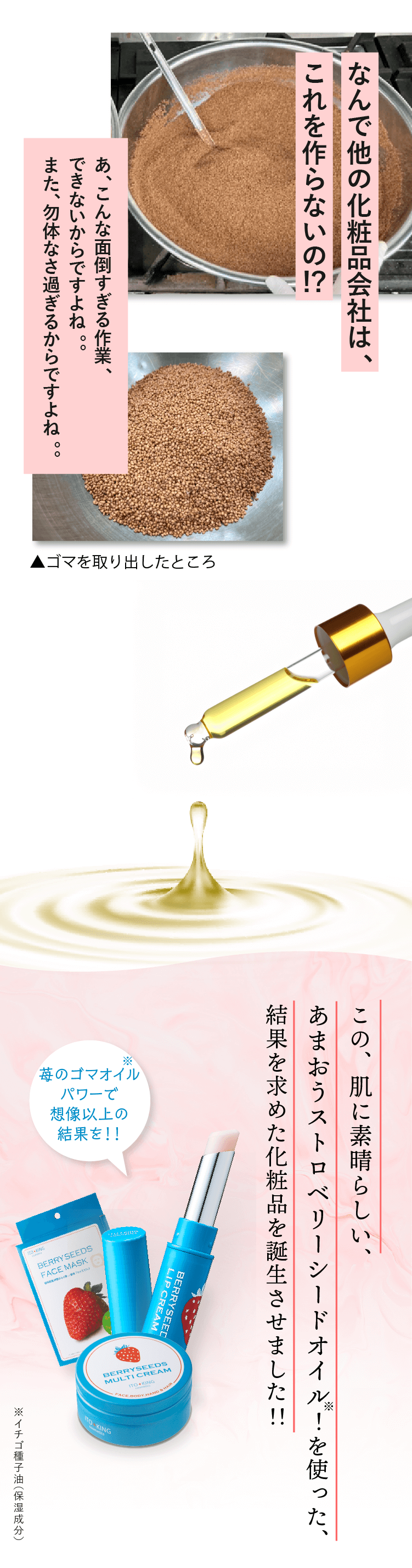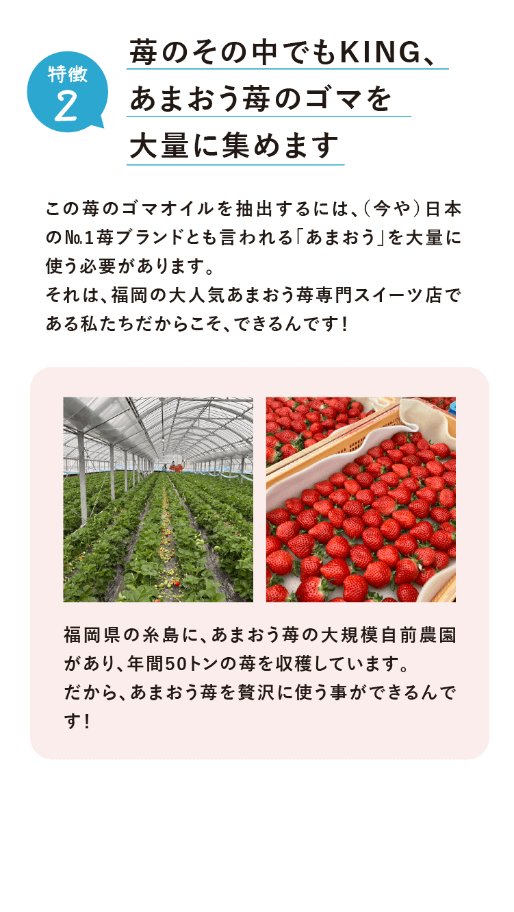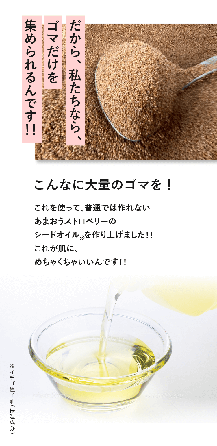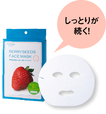 フェイスマスク。苺専門店のスイーツショップだからこそ大量の苺を使い、その中から苺の種子(ごま)を抽出。更にそこから種子オイル(※)を作り出したのです。そんな苺種子オイル(※)は、毎日、お忙しいあなたの肌を包み込むようにケアしてくれるのです。