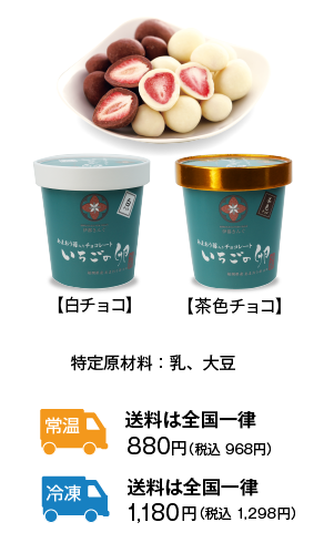 | 原材料名 | 【白チョコ】 チョコレート(ココアバター、砂糖、全粉乳、脱脂粉乳、 乳糖)(国内製造)、乾燥苺、植物油脂/乳化剤、香料、 (一部に乳成分・大豆を含む) 【茶色チョコ】 チョコレート(砂糖、ココアバター、カカオマス、全粉乳、 脱脂粉乳)(国内製造)、乾燥苺、植物油脂/乳化剤、香料 、 (一部に乳成分・大豆を含む) |